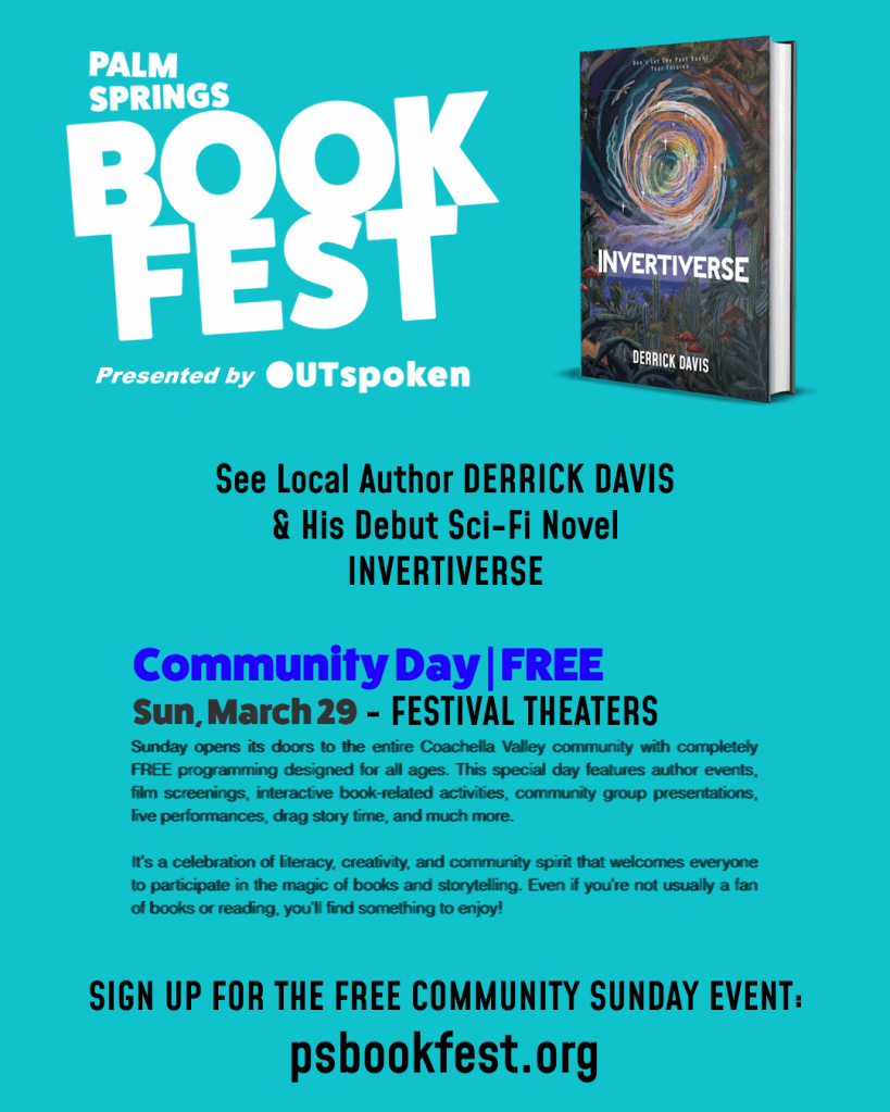 On November 7–9, 2025, Derrick was part of the Twentynine Palms Book Festival promoting ‘Invertiverse‘ and selling signed copies—all of which SOLD OUT. Postcards with some of the novel’s illustrations, stickers, and the soundtrack CD were also available. “Dennis,” a dog-sized pet dinosaur character from the novel, was also there—offering free business cards from his pet bowl. On the second night, Derrick gave a special reading from his novel’s prologue during the ‘Voices Of The Desert’ event. The entire festival included a great community of authors & readers and it was wonderful for him to get to know everyone!
