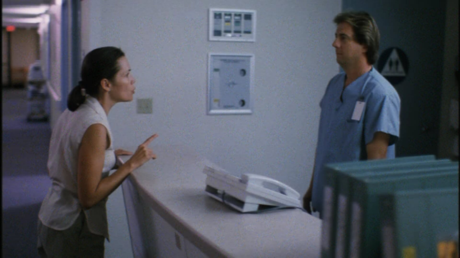 Dearden is not far from us in the hallway, only several yards away, urgently speaking into a payphone on a wall, as Thomerson approaches her from behind. His character, Sam, has just learned that Artie had died before reaching the hospital, and Lauren already knew. Clearly in denial, Lauren tells Sam that they need to get Artie’s things from the motel and bring them to the hospital. Sam firmly holds her as he plainly states that Artie is dead. Lauren snaps, shouting with further denial, until she sobs. Upon accepting the harsh reality, she then begins to blame herself for Artie’s death—continuing to sob into a hysterical state, until she slumps to the floor while in Sam’s comforting arms.