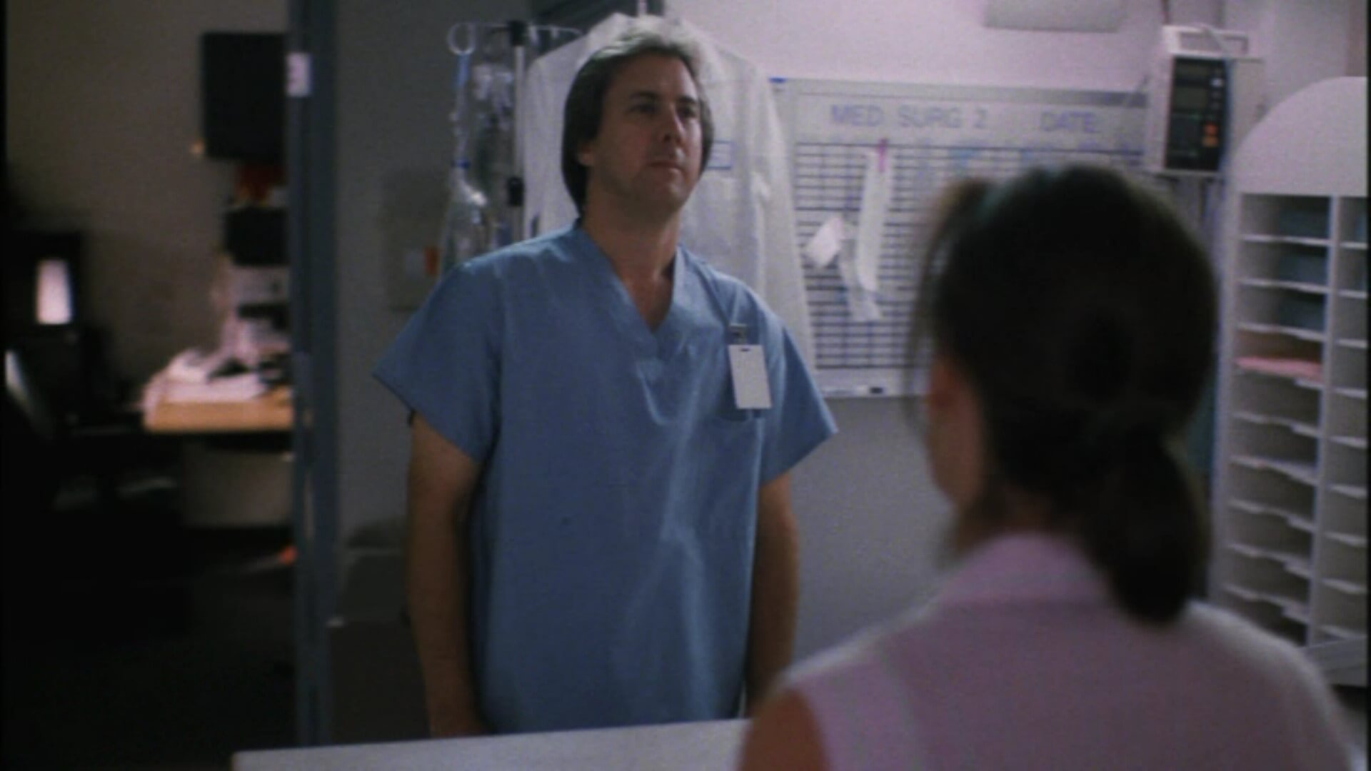 Once lunch was over, everyone moved into the hospital, setting up a sequence within a closed-off hallway that didn’t have any patients. My dad was now wearing plain blue clothes and a white name badge. He portrayed an orderly that stood silently behind a counter as Dearden’s character, Lauren, demands to see “Artie,” played by Jay Thomas.
