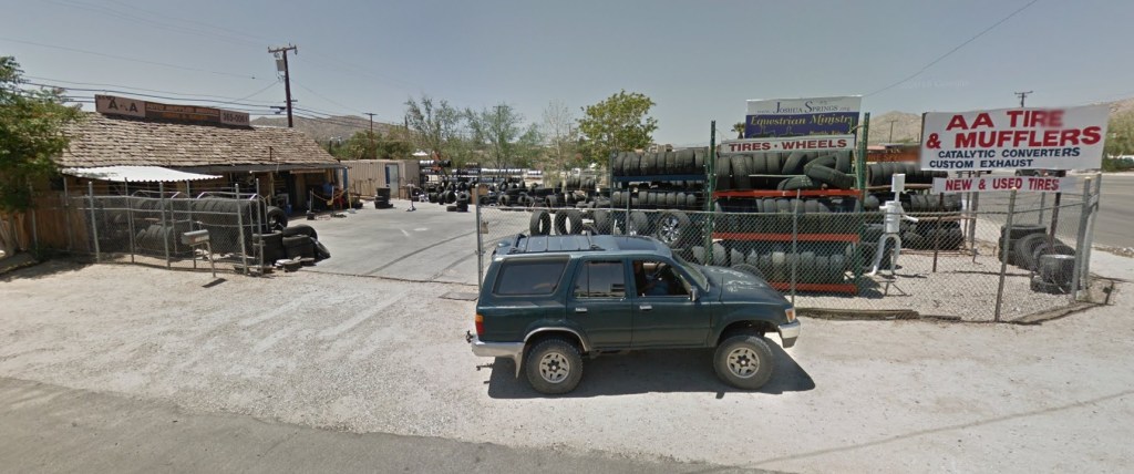 The following day, July 11th, we went to their next filming location in Yucca Valley: AAA Tire & Mufflers, standing in for the fictional “Hub Cap City.” They filmed in a fenced area outdoors that was naturally part of the location. In the scene, producer Bill Timoney portrays Lance’s friend & co-worker “Buddy,” as he points out various mufflers attached to a wooden wall. Sitting nearby, on a mass of tires for seats, are Lance and his other co-worker “Mark,” played by Bill’s real-life brother Mike Timoney.