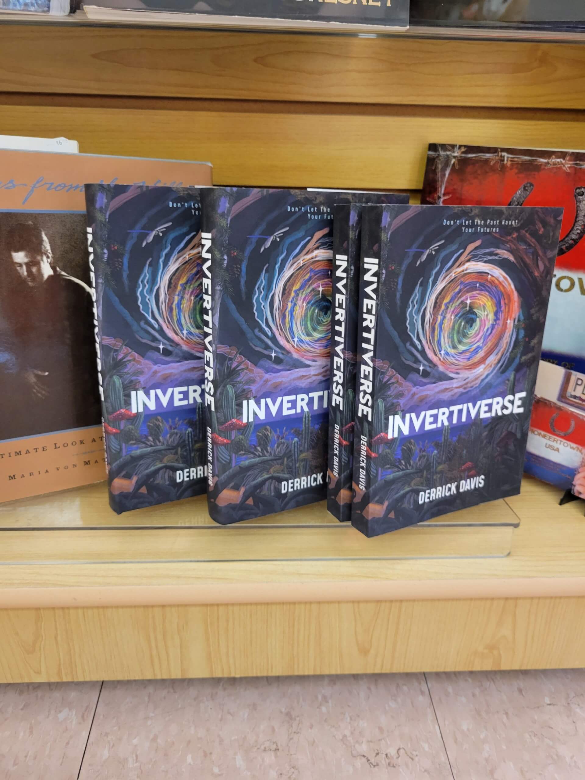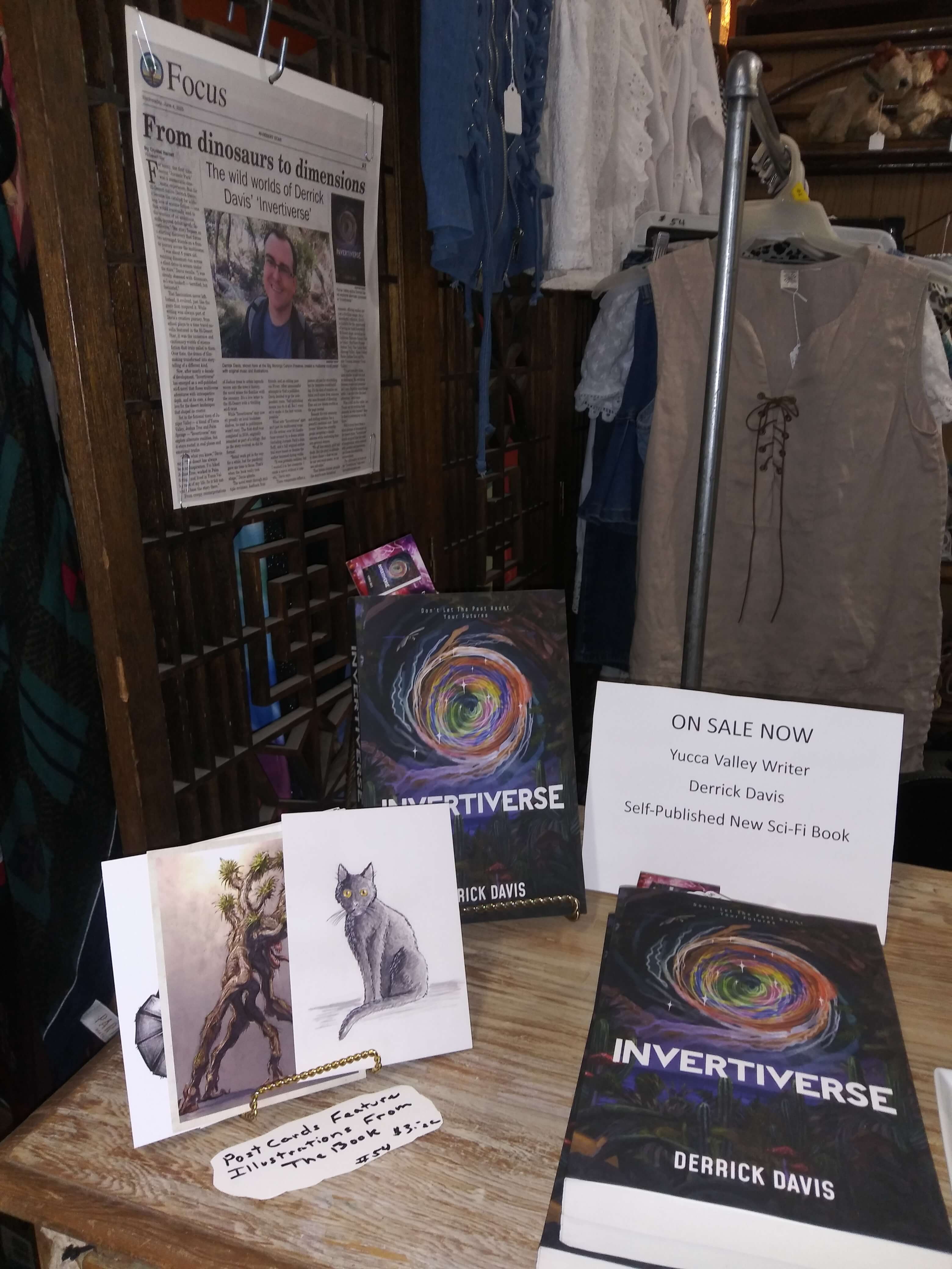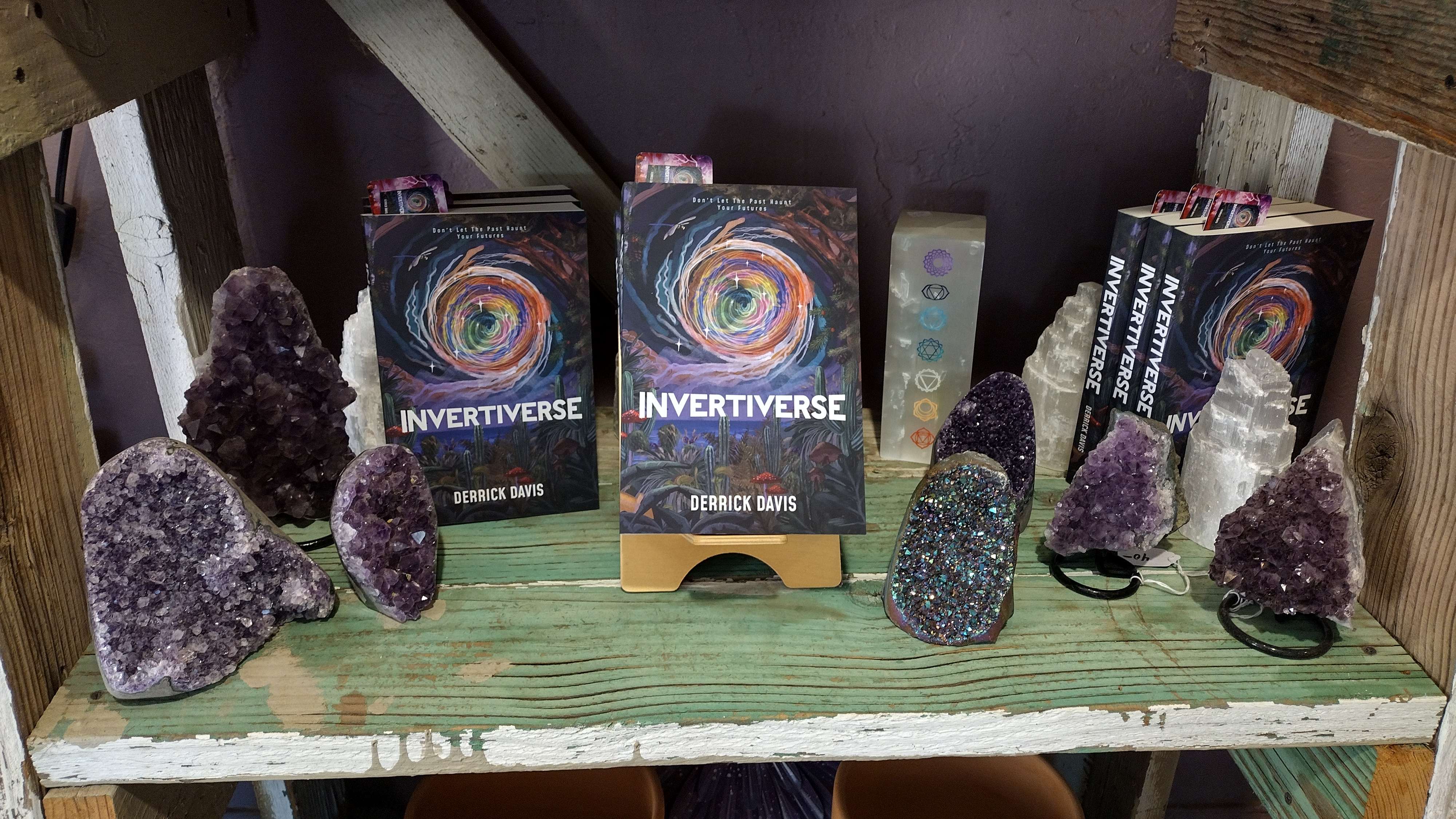 ‘Invertiverse‘ is available at several local retail stores. This includes: Cactus Mart (Morongo Valley, CA), California Welcome Center (Yucca Valley, CA), & Pioneer Crossing Antiques (Yucca Valley, CA). All copies available at these locations feature a signature by author Derrick Davis. The novel was also available at the 29 Palms Book Festival & the Desert General Store (29 Palms, CA) in November, 2025.