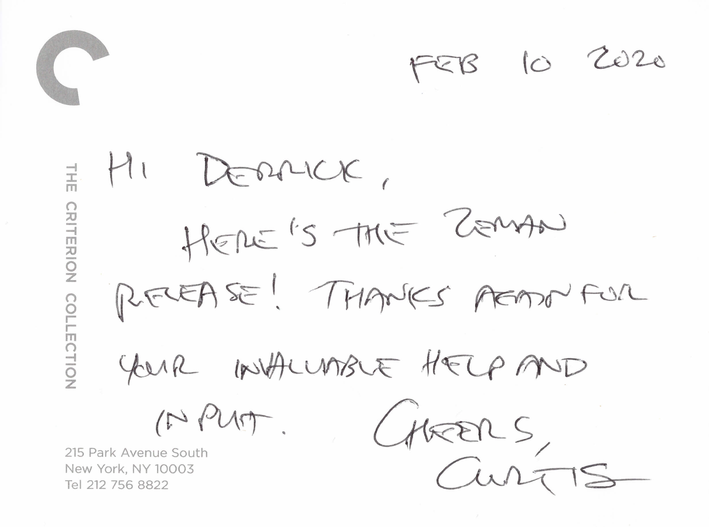 Criterion performed a scan of the print themselves, then used my restoration edit as a guide. They replicated exactly what I had done with the VHS but replaced it with the 16mm print.