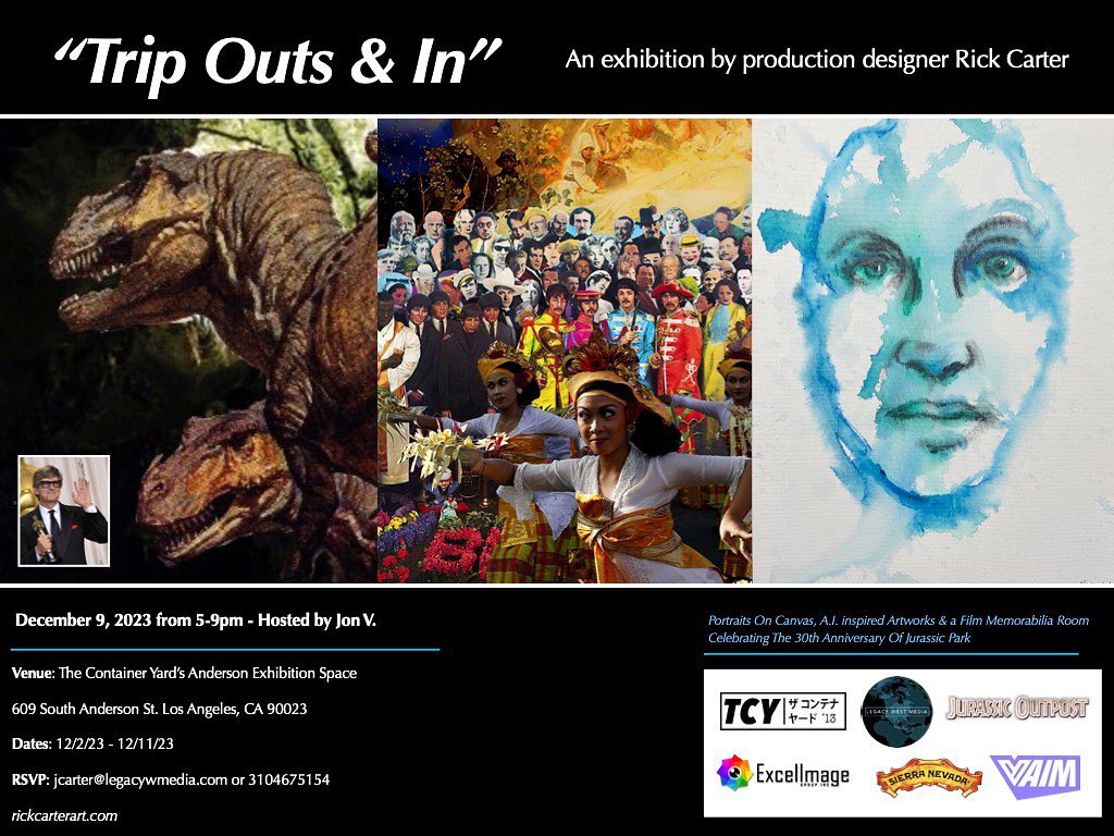 Production designer Rick Carter’s art exhibition in Los Angeles, “Trip Outs & In,” was a showcase of his recent original paintings, cinematic collages, and A.I. inspired collages. It included Rick’s “cinema room,” featuring artworks that reflect his production design process and film memorabilia from ‘Jurassic Park!’ This special exhibit was created by Rick’s son, Jim Carter, through his Artist Agency Legacy West Media. Sponsorship partners included The Container Yard, Excel Image Group, Sierra Nevada, The Lapis Press, & Jurassic Outpost (via Derrick Davis)!