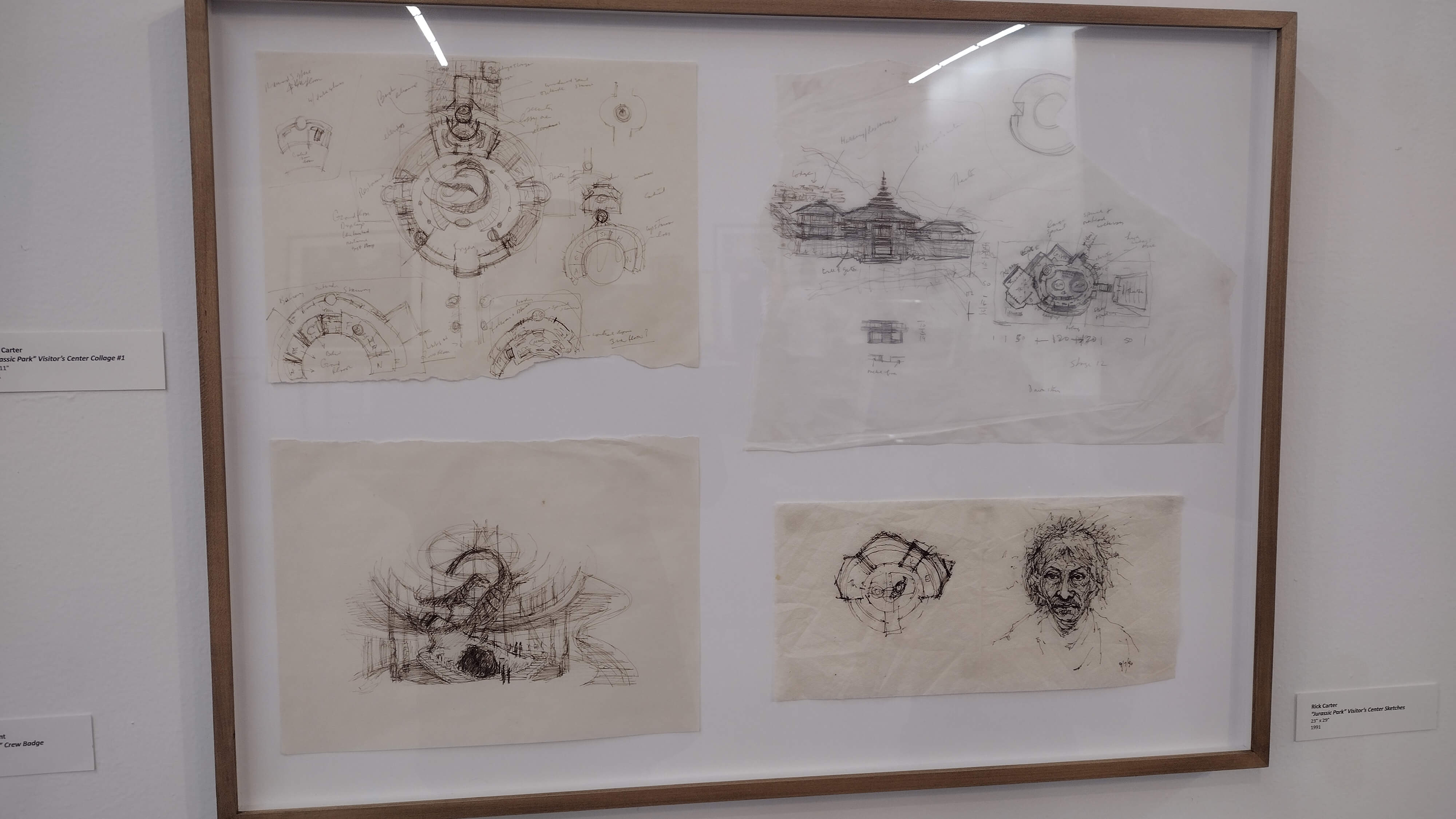 Rick Carter’s production design process has been instrumental in bringing classic films to life for decades, such as ‘Forrest Gump,’ ‘Back To The Future 2,’ & ‘Avatar.’ They all got a spotlight in the “cinema room,” but Rick’s ‘Jurassic’ art featured unique collages he created during ‘Jurassic Park’ and ‘The Lost World: Jurassic Park.’ For the first film, he cobbled together ideas for the now-iconic Visitor Center, and for the sequel he depicted dinosaurs on and off Isla Sorna.